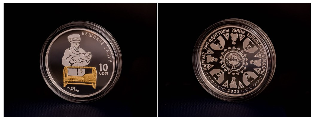 | 3 | Бешикке салуу | 10 сом | серебро 925° | 28.28 | 38,61 | proof |