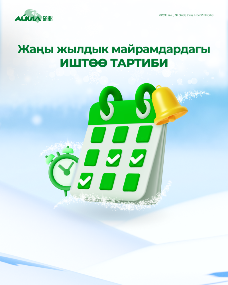 Келе жаткан жаңы жылдык майрамдарга байланыштуу Банктын кеңселеринин иштөө тартиби тууралуу маалымдайбыз: