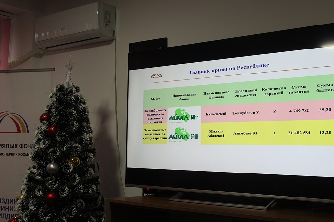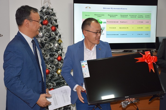 Первое место в номинации за наибольшее количество выданных кредитов под гарантии ОАО «ГФ» по Иссык-Кульской области занял Султан Кашбаев из Чолпонатинского филиала ОАО «Айыл Банк». Он также награжден телевизором.