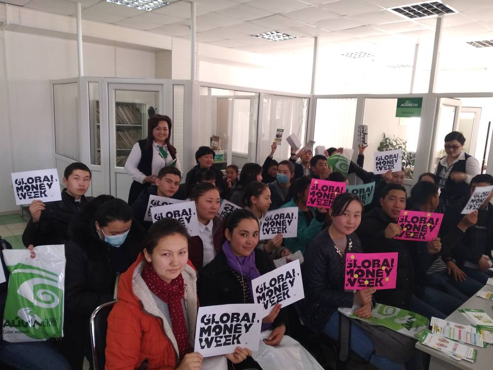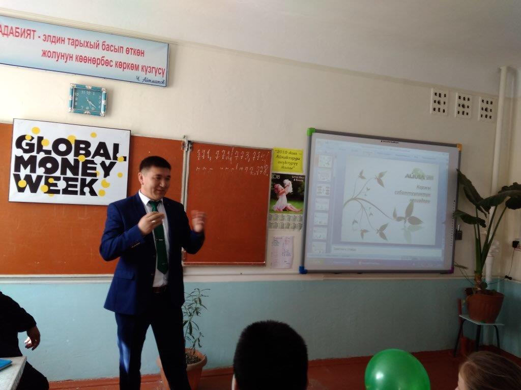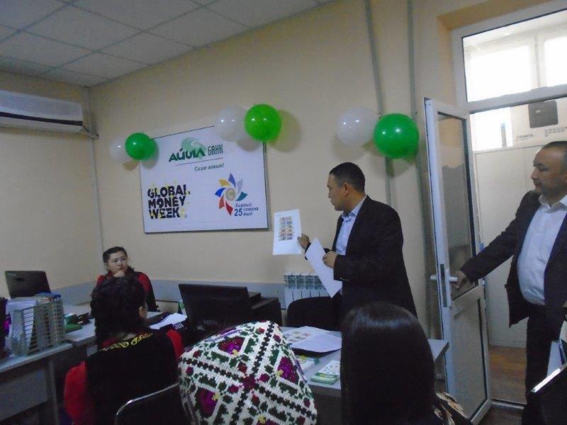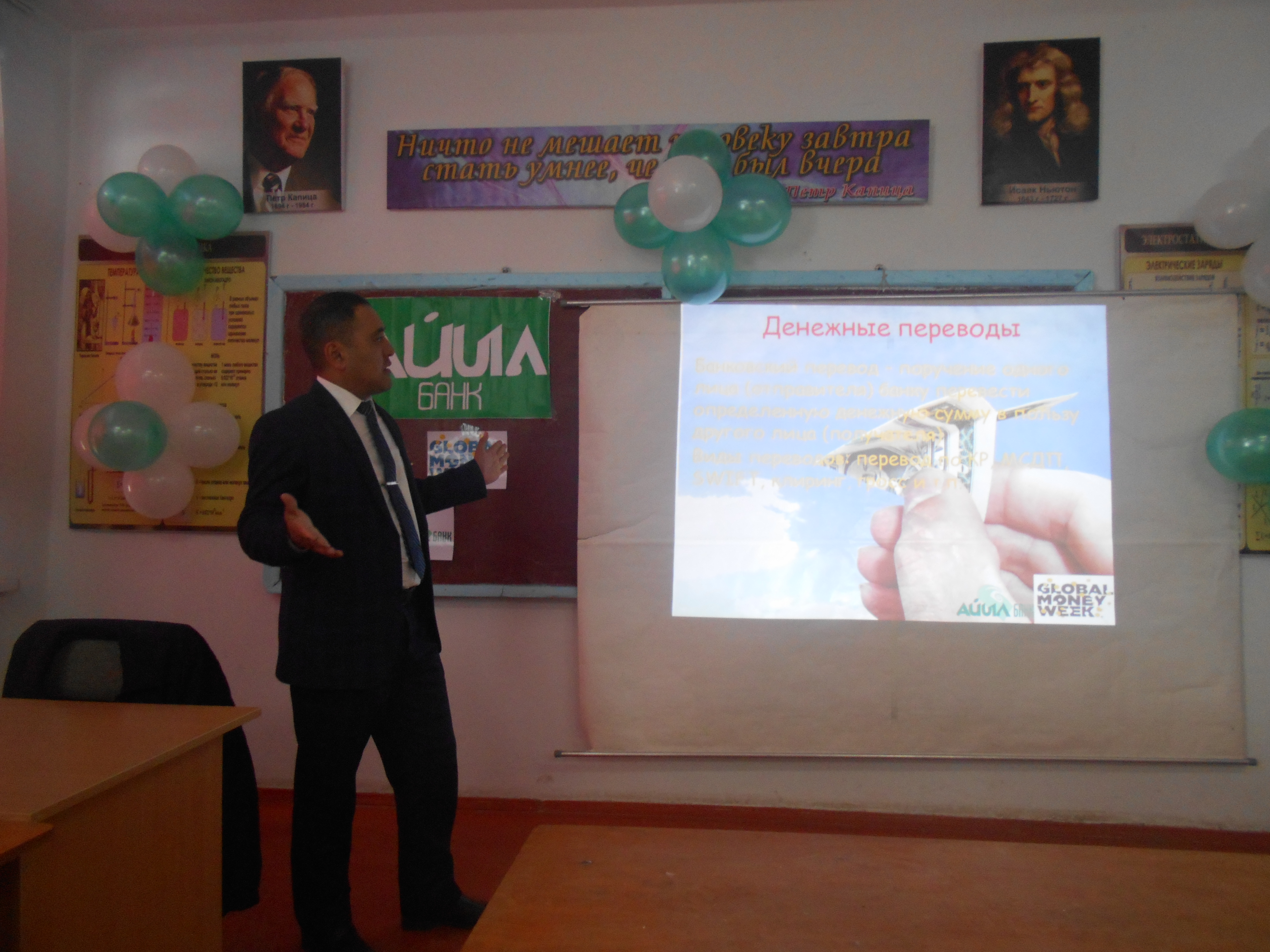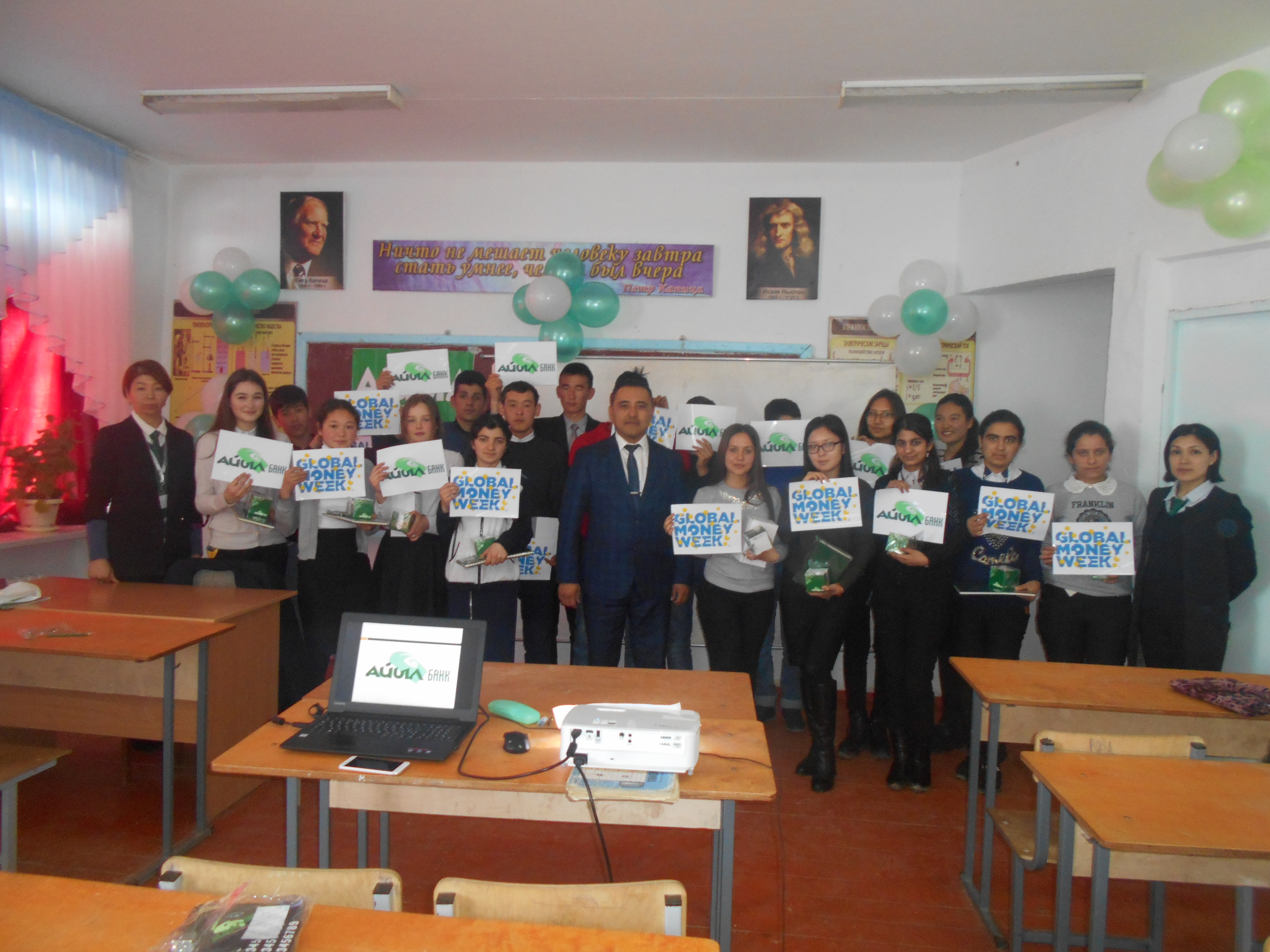 Были приглашены свыше 30 человек- учеников 9 и 10 классов из школы- гимназии им. Н.Жундубаевой, которым подробно рассказали о целях и задачах «Всемирной недели денег», пояснили само понятие «Банк» и его работу, показали как работает денежно - счетная машинка, наглядно посчитали денежные купюры. Ребята задавали интересные вопросы и на них получали исчерпывающие ответы.
