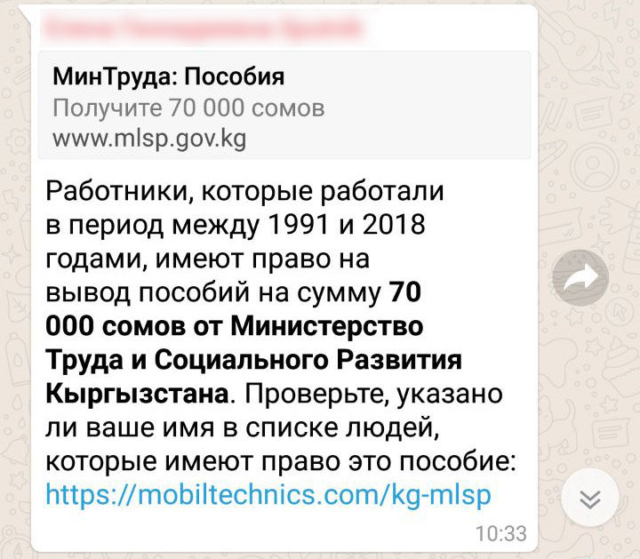 Недавняя мошенническая рассылка о пособиях, которые якобы выдаются Министерством Труда и Социального Развития Кыргызстана, также вела на данный интернет ресурс: