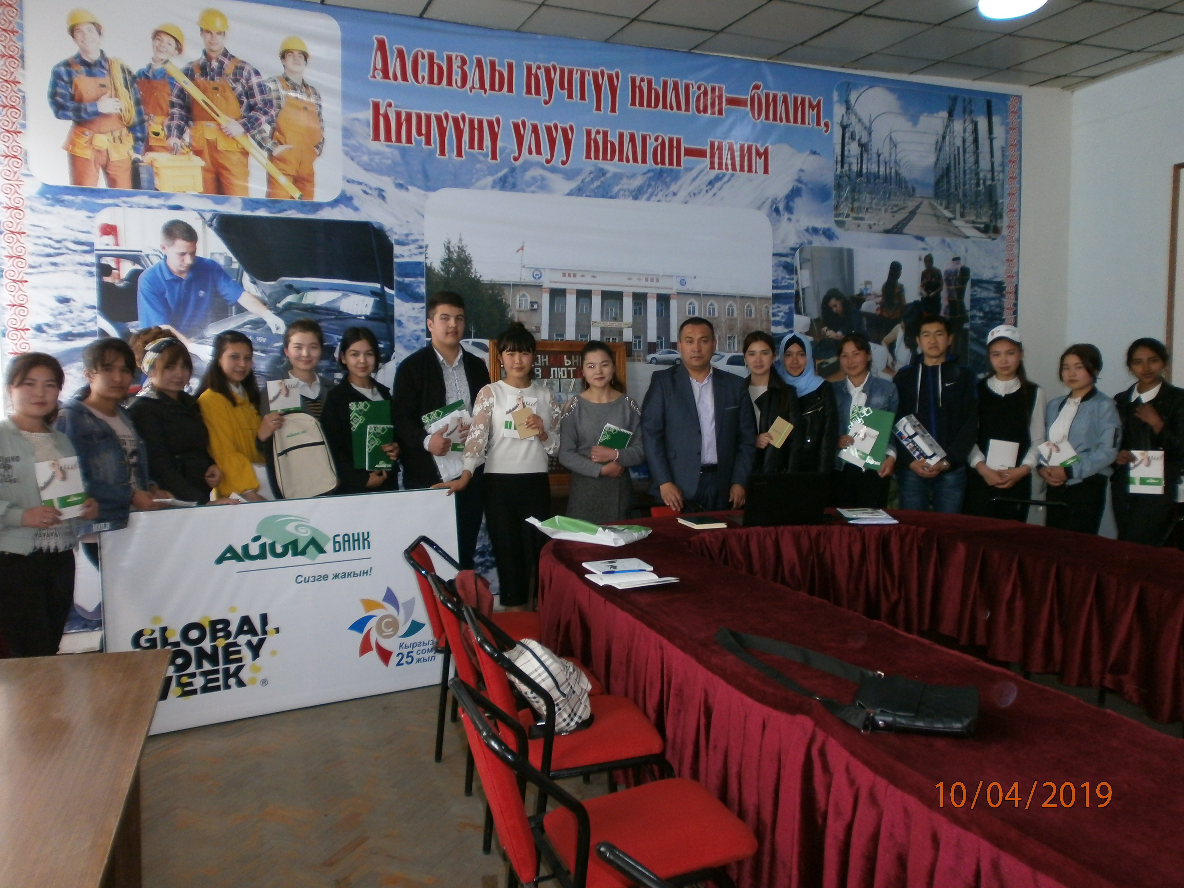 На данное мероприятие были приглашены студенты Горнотехнического колледжа им. Т.Кулатова. Управляющий филиалом Абдикамал Насиров лично провел тренинг на тему Национальной валюты, рассказал о функции денег, об истории развития национальной денежной валюты. Также рассказал об уровне банковской системы КР и об этапах развития и становления ОАО "Айыл Банк". Также была проведена викторина и хорошо ответившим студентам вручили ценные подарки.