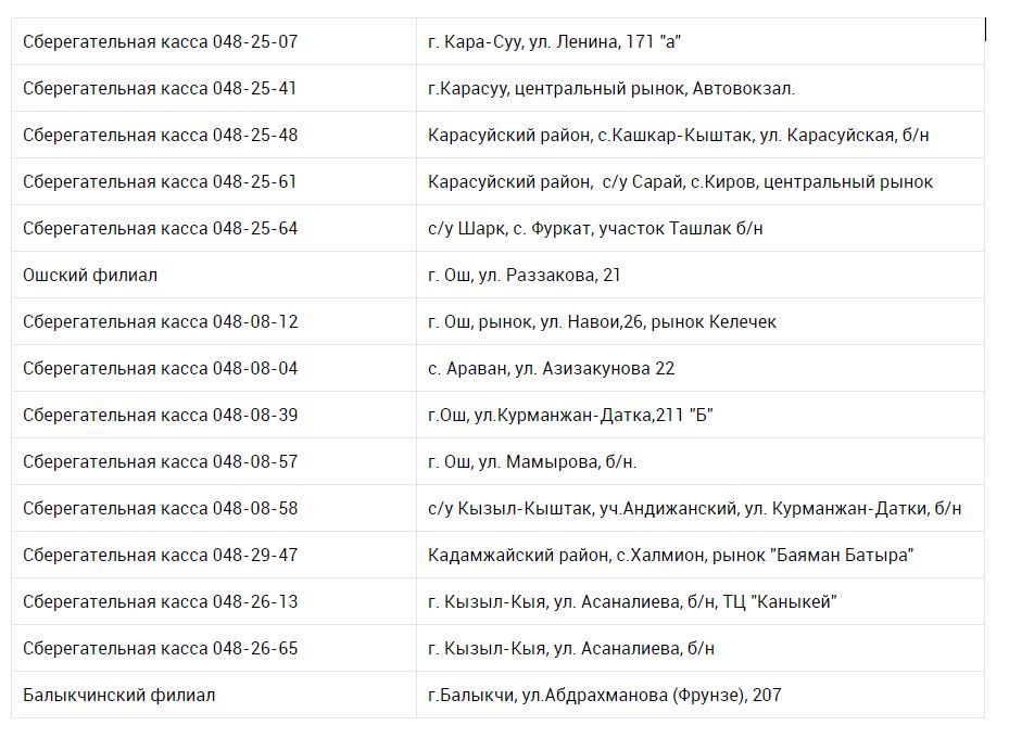 - 9-го мая будут работать два подразделения банка: филиал "Бишкек-Мээрим" (г.Бишкек, ул.Абдрахманова 119) и Сберегательная касса 048-33-68 (г.Бишкек, ул.Суеркулова, 18 торговый центр "Жарал Mall").